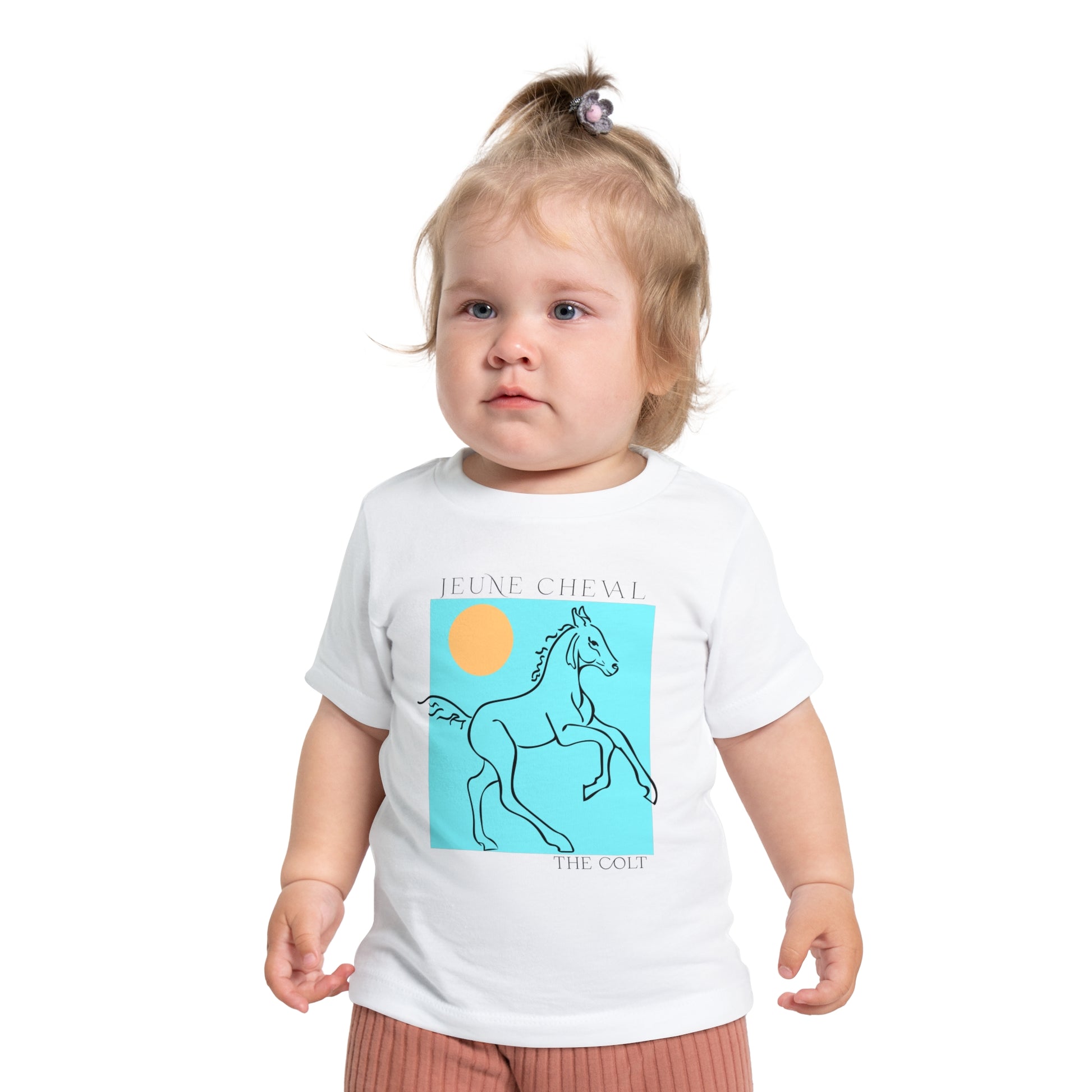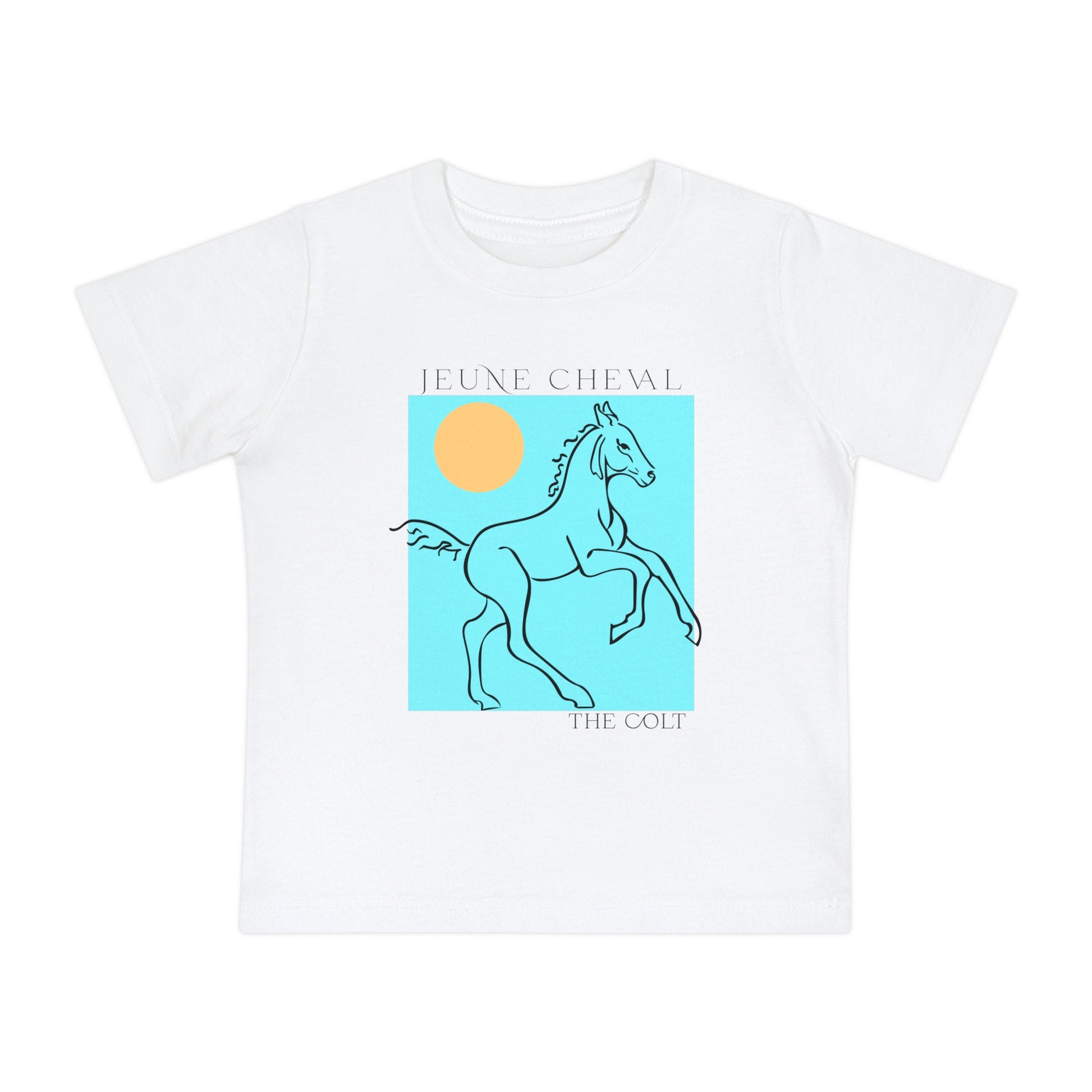 Introducing our Modern Colt crew neck t-shirt for babies. Your little one will look stylish and feel comfortable taking their first steps in this super-soft tee. Made from pre-shrunk, 100% airlume combed and ringspun cotton, this t-shirt is not only comfortable but also shrink-resistant and durable. The lightweight fabric allows your child to move freely and comfortably throughout the day. The regular fit ensures a relaxed and comfortable look, while the tear-away label adds an extra level of convenience for adults. The Modern Colt design on the front of the shirt is eye-catching and stylish, making it a great addition to any wardrobe. Choose from a variety of designs to find the perfect match for your child's style.